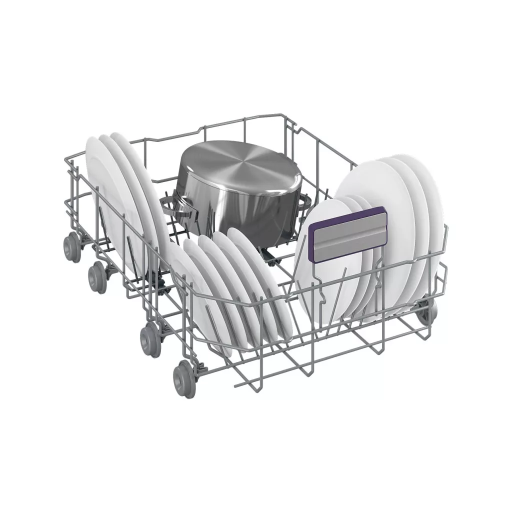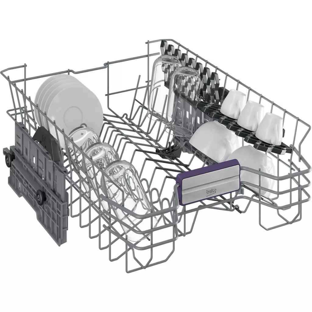 A Beko szabadonálló mosogatógép modern technológiákkal gondoskodik az edények alapos tisztításáról és fertőtlenítéséről. Az AquaIntense® nagy nyomású fúvókái hatékonyan eltávolítják az odaégett vagy beszáradt ételmaradékokat, így nincs szükség előáztatásra. A HygieneIntense funkció forró gőzzel fertőtleníti az edényeket, míg a Quick&Shine program mindössze 58 perc alatt tiszta és száraz edényeket biztosít. A praktikus evőeszköztálca több helyet hagy az alsó kosárban a nagyobb edények számára.