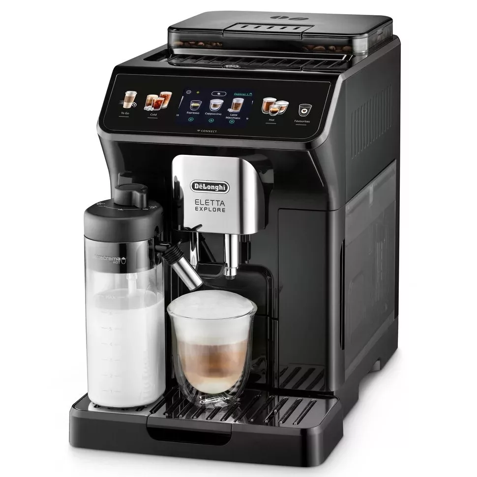 A kifinomult, fekete színűre festett előlap mögött az új De'Longhi Eletta Explore automata kávéfőző több mint 50 forró, hideg és cold brew italt kínáló kincstára rejlik.