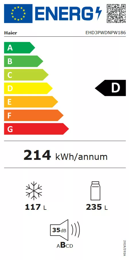 Haier 2D 60 Series 3 PRO EHD3PWDNPW186D 2 ajtós hűtőszekrény, D energiaosztály, fehér