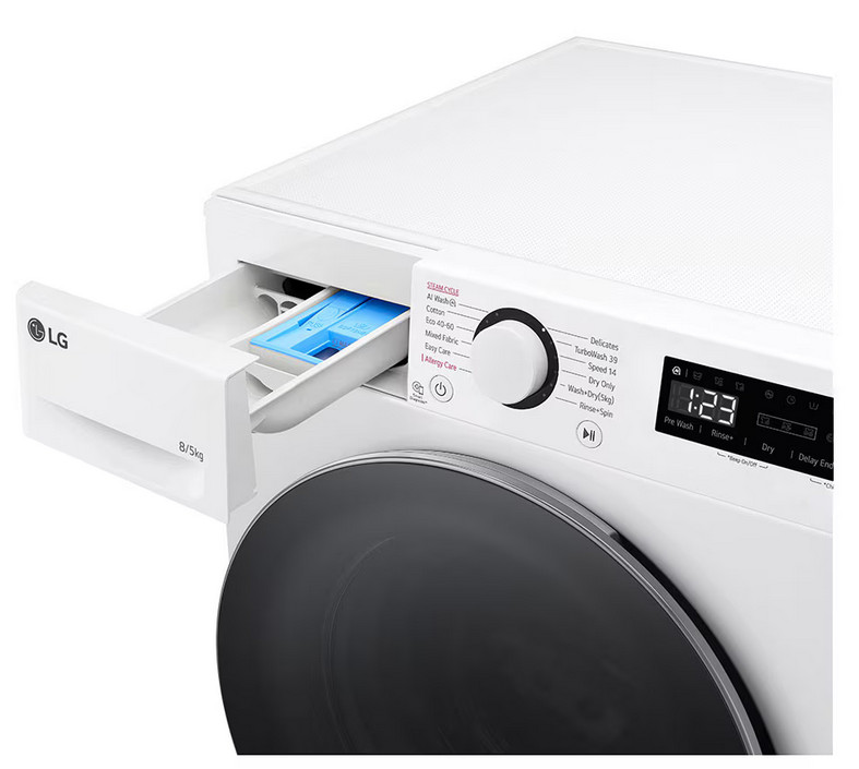 • Kettő az egyben: 8 kg mosási és 5 kg szárítási kapacitás, külön szárítógép nélkül.