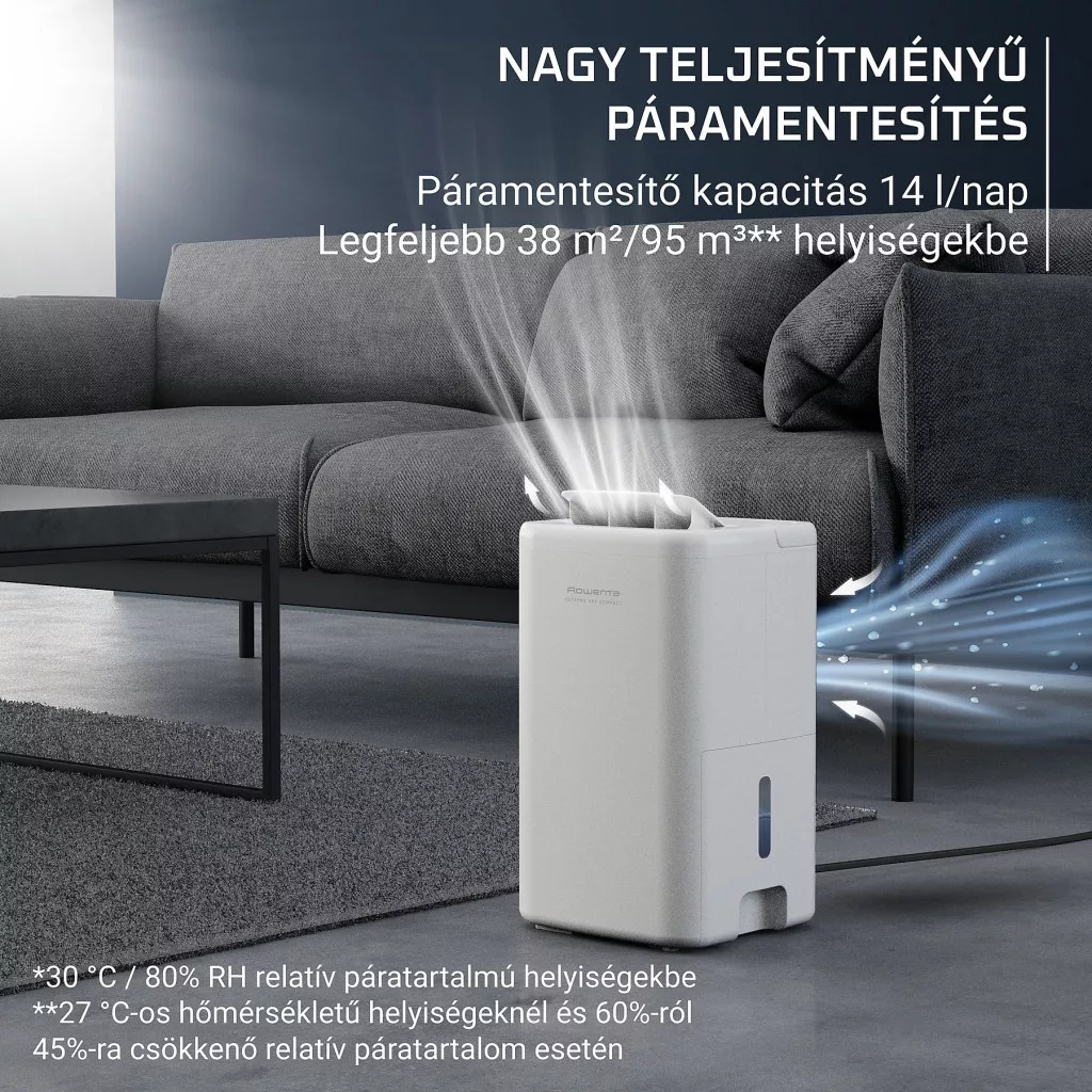 • Nagy teljesítmény: napi akár 14 liter páramentesítés 38 m²-es helyiségig.