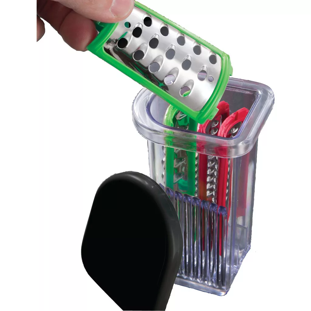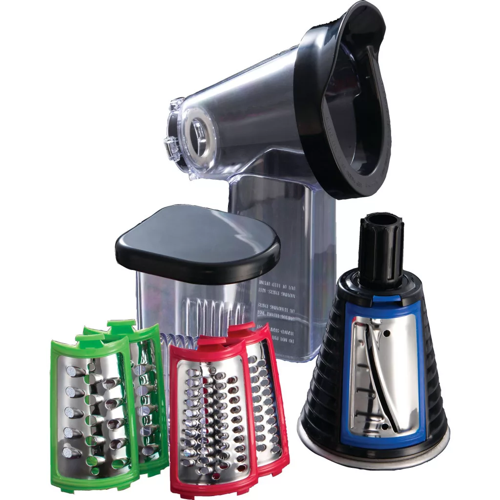 • 3 rozsdamentes acél tartozék: szeleteléshez és reszeléshez