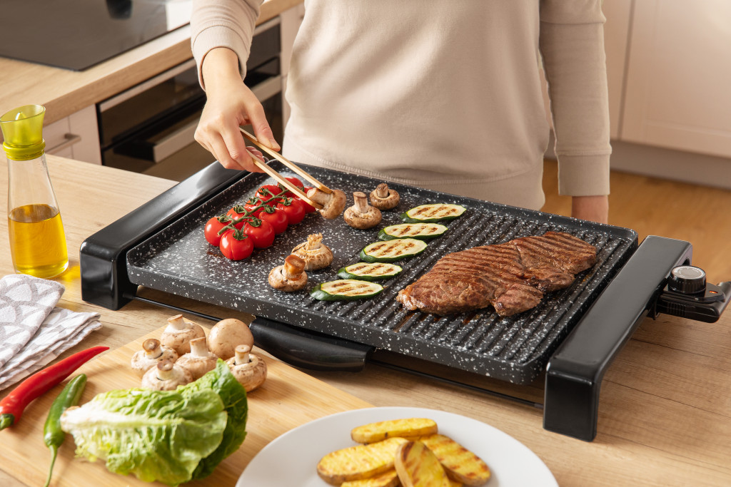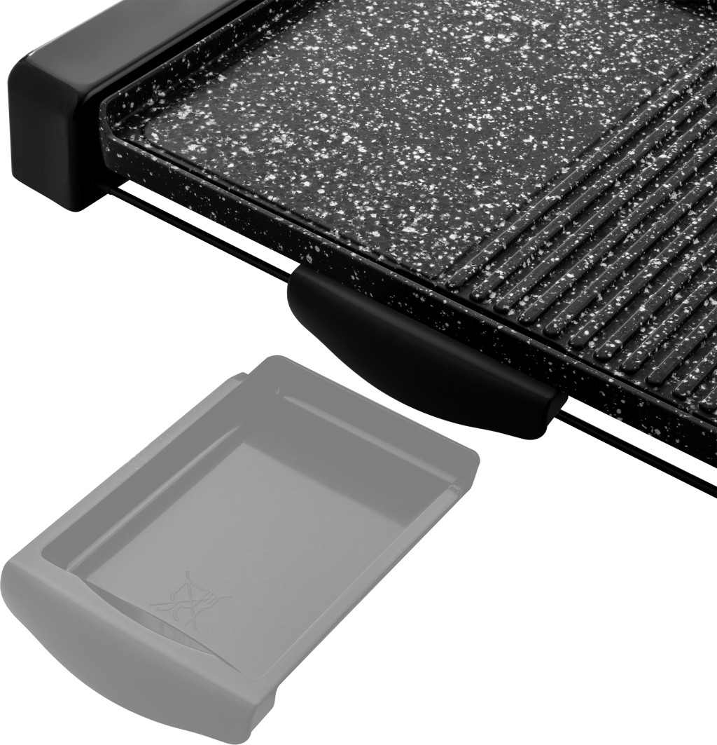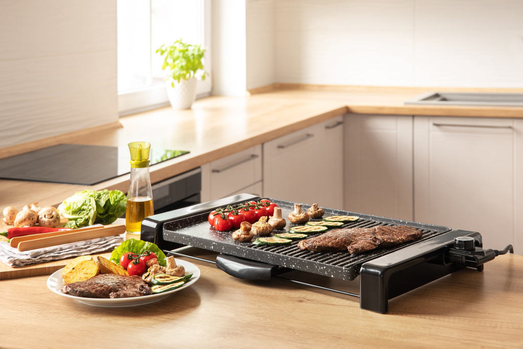 Kompakt, mégis nagy sütőfelületű, 2 az 1-ben asztali grill mindennapi és hétvégi grillezéshez. A sima és bordázott sütőlapokkal zöldségtől a szaftos steakig bármit elkészíthetsz. A beállítható termosztát pontos hőfokválasztást ad (melegen tartástól a húsokhoz ideális magas hőfokig), a kétszer tartósabb gránit felület pedig tapadásmentes, könnyen tisztítható és egészségtudatos használatot tesz lehetővé. A kivehető csepptálca összegyűjti a felesleges zsiradékot – kevesebb olaj, tisztább konyha.